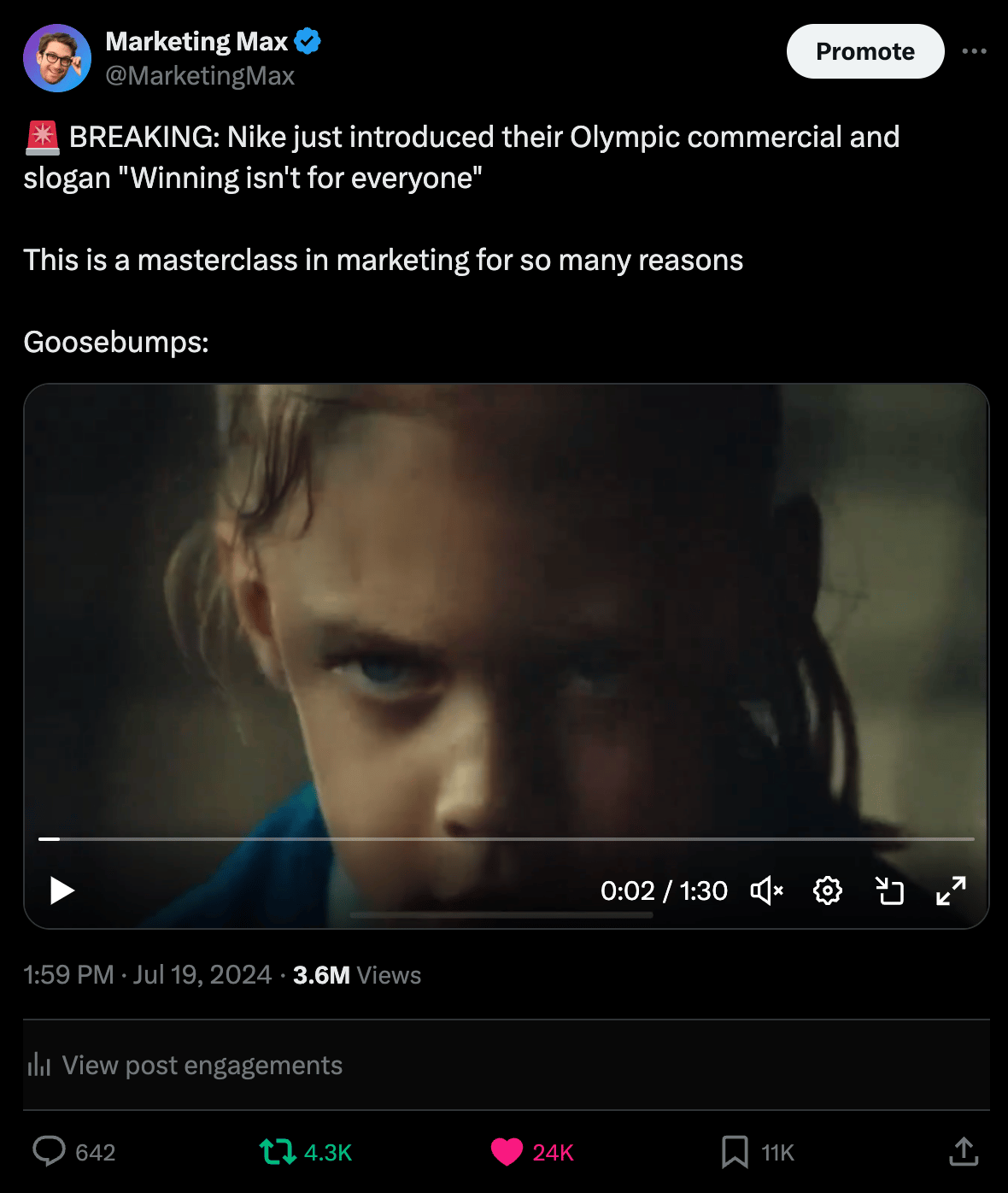 On Friday I tweeted Nike’s new Olympic commercial and it went viral to the tune of 3.6m views, 24k likes, and 11k bookmarks, & 3k new followers…